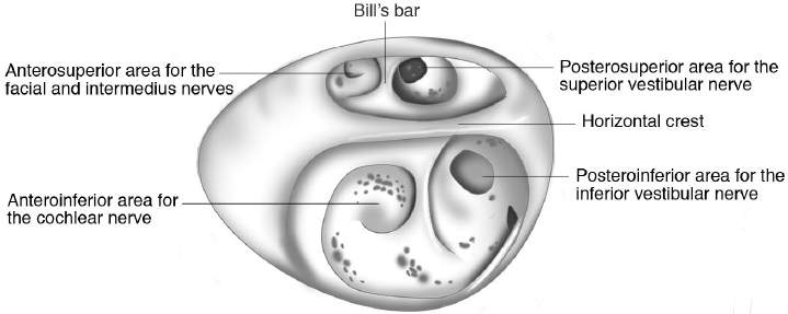 • Horizontal Crest (Falciform Crest): Divides IAM fundus into superior (Facial, Superior Vestibular) and inferior (Cochlear, Inferior Vestibular) compartments.