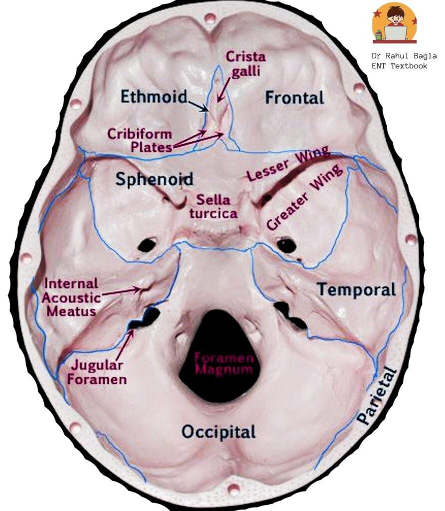 • Anterior: The sphenoid bone (its greater wings) lies between the right and left temporal bones.