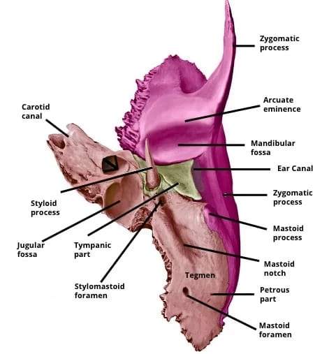 • Temporal bone parts: Squamous, Petrous, Mastoid, Tympanic, Styloid.