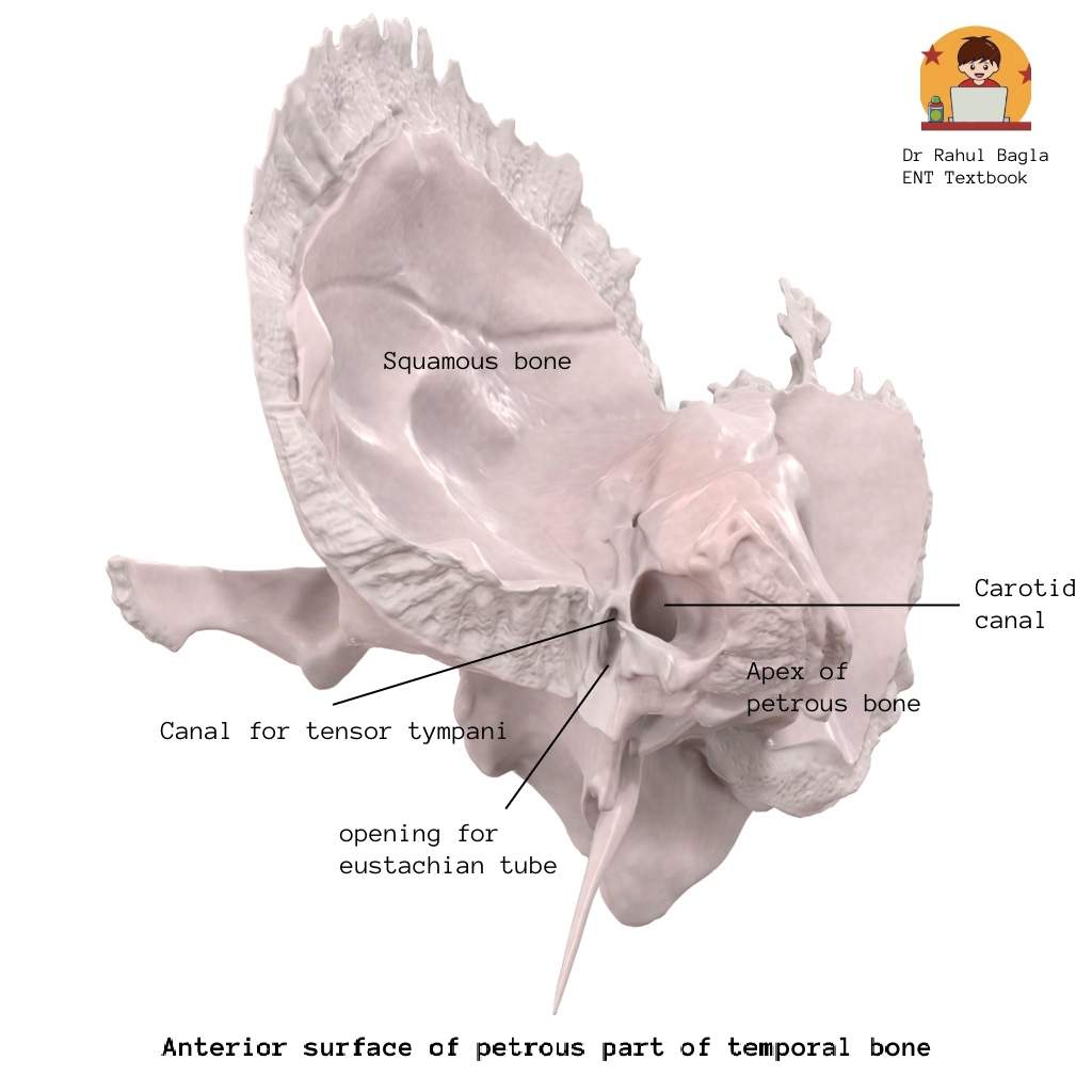 • Anterior surface – It forms the posterior wall of the middle cranial fossa. It presents four important structures (medial to lateral), the trigeminal impression (lodges trigeminal ganglion), the roof of internal acoustic meatus, arcuate eminence and the roof of the middle ear (tegmen tympani). The depressed area, just lateral to the trigeminal impression is the roof of the internal acoustic meatus. The elevated area, just lateral to the roof of the internal acoustic meatus is the arcuate eminence, which is formed by the underlying superior semicircular canal. The rest of the area lateral to the arcuate eminence towards the squamous part of the temporal bone is the roof of the middle ear (tegmen tympani). The area of the roof of the middle ear cavity presents two hiatus for greater and lesser petrosal nerves. It also presents two openings, the canal for tensor tympani (upper one) and the opening of the bony part of the eustachian tube (lower one), both of which open in the middle ear cavity.