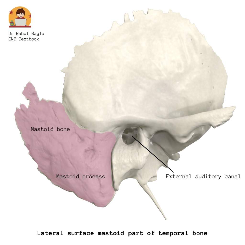 • Lateral surface is continuous with mastoid process which provide attachment of sternocleidomastoid, splenius capitis and longissimus capitis muscles. Mastoid process is present just posterior to the external auditory canal opening and it is not fully developed in children. A more horizontal postauricular incision should be given to prevent injury to the facial nerve.