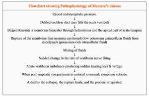 Pathophysiology. The underlying pathology in Meniere’s disease involves the excessive accumulation of endolymph within the membranous labyrinth, leading to distention and rupture of the membranous labyrinth. This results in a mixing of endolymph and perilymph, which disrupts the ionic composition and affects the function of the inner ear. The mechanisms contributing to this excessive fluid accumulation include: