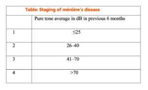 The staging system is essential in the diagnosis of certain, definite and probable Meniere’s disease. It is based on the average of pure tone thresholds at 0.5, 1, 2 and 3 kHz (rounded to the nearest whole) of the worst audiogram during 6 months before start of treatment.